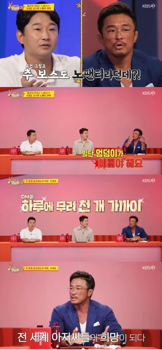 25일 방송된 KBS 2TV '사장님 귀는 당나귀 귀'에서는 추성훈이 천 개 가깝게 오는 DM에 답장을 하고 있다고 밝혀 눈길을 끌었다.