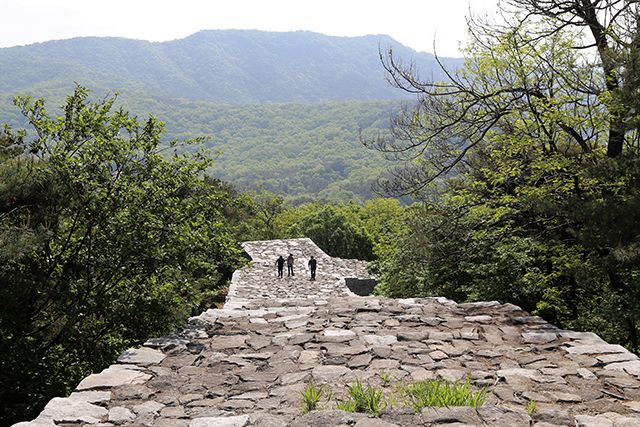 가운데 중앙 계곡부 안쪽 등산로를 따라가면 6부 능선에 있는 건물 터가 보인다. 터마다 줄지어 남은 주춧돌이 꽤 큰 건물이 있었음을 짐작게 한다. 3단 석축 지역서 확인된 동서 510m, 남북 700m 규모 저수 시설이 핵심이다. 산성 안에 샘과 못이 많다는 것은 장기전이 가능하다는 뜻. 아직 마르지 않은 집수정에 신록의 그림자가 드리운다.