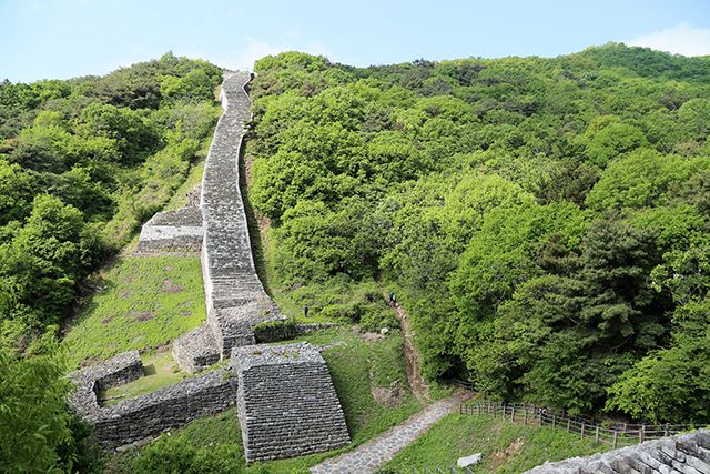 성벽 길은 동문지 안에서 세 갈래로 나뉜다. 오른쪽 성벽으로 방향을 잡아 나무 계단을 오르면 평평한 석축을 밟아볼 수 있다. 성벽을 기어오르는 적을 공격하는 돌출부인 치(雉)는 모두 10개다. 동북쪽 치에 올라서면 반대편 남쪽으로 향한 석축과 동문지의 옹성이 한 눈에 들어온다. 복원된 미륵산성 전체를 조망할 포인트다.