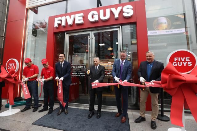 26日,美国连锁汉堡品牌Five Guys位于韩国的首家门店落户首尔瑞草区,美国驻韩国大使菲利普·戈德堡、韩华Galleri战略本部长金东宣等有关人士为门店开业剪彩。