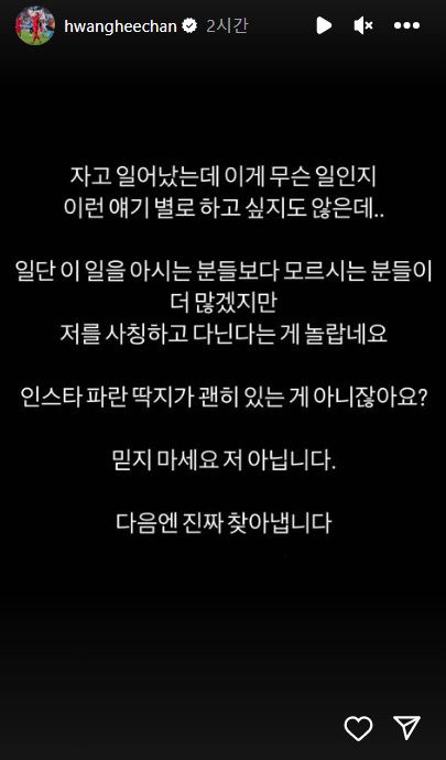 또 그는 "인스타 파란 딱지(공식 인증 마크)가 괜히 있는 게 아니잖아요? 믿지 마세요. 저 아닙니다. 다음엔 진짜 찾아냅니다"라며 사칭범을 향해 경고했다.