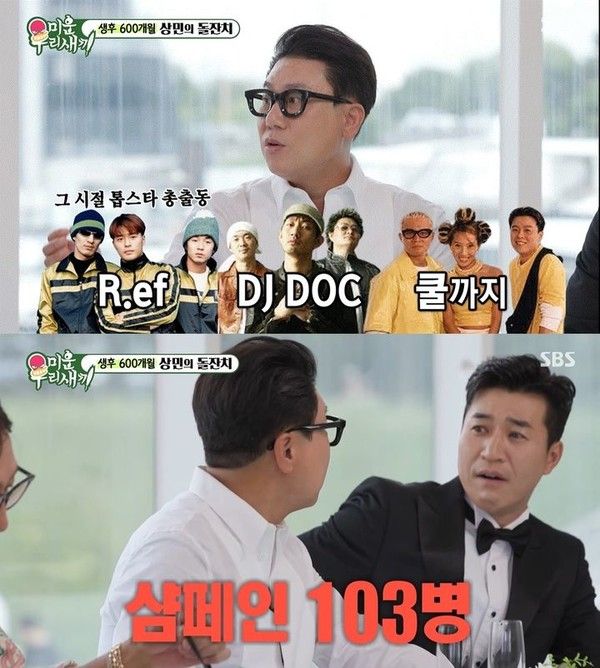 이상민은 눈뜨고 일어나니 샴페인 103병이 나왔다고 했다. "두 잔 먹고 난 뻗었는데, 눈 뜨고 일어나니 계산하라고 하더라"며 헛웃음을 지었다.
