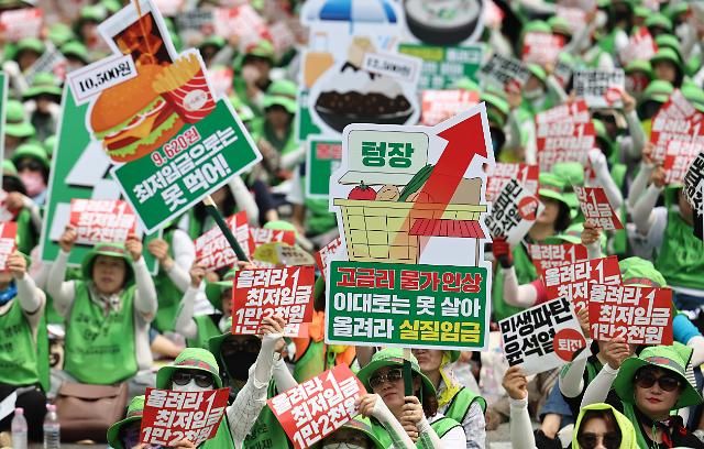 24日,在首尔惠化站附近,民主劳总会员们正在举行集会,要求提高最低薪资标准。【图片来源 韩联社】