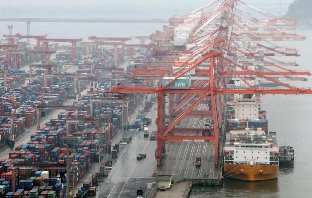 21日,釜山港神仙台码头的露天堆放场遍布集装箱。【图片来源 韩联社】