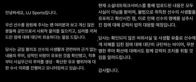 그러면서 "현재 소셜네트워크서비스를 통해 업로드된 내용은 모두 사실이 아님을 밝히며, 불법으로 취득한 선수의 사생활을 유포하고 확산시킨 점, 이에 따라 선수의 명예를 실추시킨 점에 대해 강력히 법적으로 대응할 예정입니다"라고 법적 대응을 예고했다.