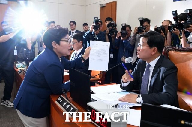 지난달 24일 환경노동위원회 여당 간사인 임이자 국민의힘 의원(왼쪽)이 국회에서 열린 환경노동위원회 전체회의에서 노란봉투법(노동조합 및 노동관계조정법 2·3조 개정안)의 본회의 직회부 요구건에 대해 전해철 환경노동위원장에게 항의하는 모습. /남용희 기자