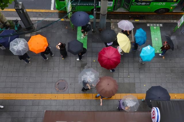 장마가 시작된 26일 오후 서울 관악구 신림역 인근에서 우산을 쓴 시민들이 버스를 기다리거나 이동하고 있다. [사진=연합뉴스]