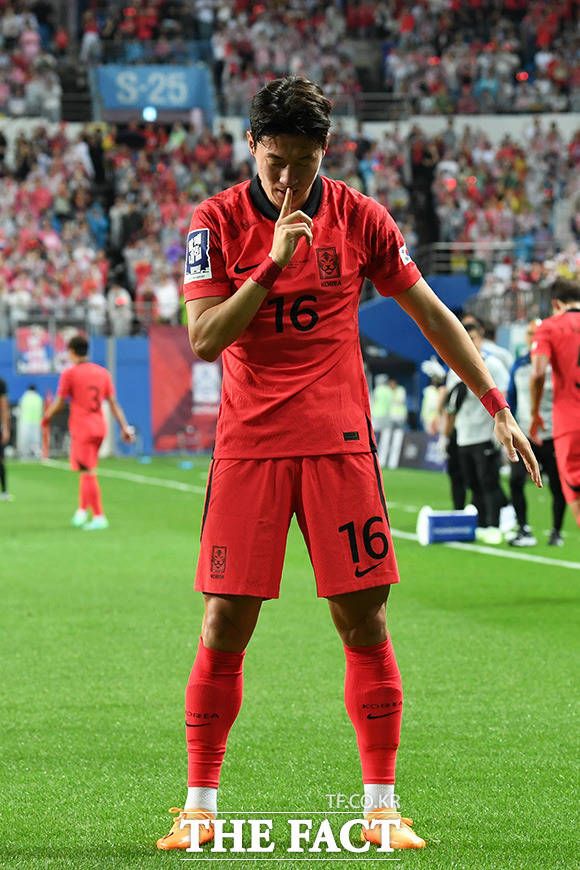 클린스만호의 공격수 황의조가 '사생활 논란'에 휘말리면서 오는 9월 유럽원정 승선이 불투명해졌다. 사진은 지난 20일 엘살바도르전에서 선제골을 터뜨린 황의조./대전=남용희 기자