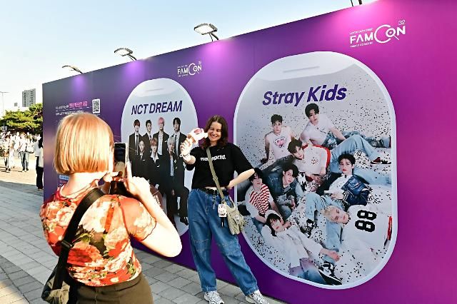 本月16日至18日,乐天免税店家族演唱会在首尔举行。图为外国游客在拍照区打卡。【图片提供 韩联社】