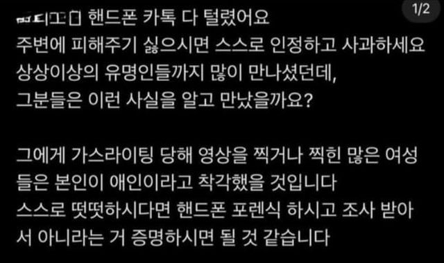 폭로자의 게시글에 따르면, 황의조는 "수십 명의 여성들을 가스라이팅 하여 성관계 사진과 영상을 찍고 이를 핸드폰에 저장해 두었으며, 여성들의 동의 여부를 알 수 없는 영상도 다수 존재한다"고 주장했고, "연예인, 인플루언서, 일반인 가리지 않고 동시에 다수와 만났고, 얼마나 많은 피해자가 나올지 모르겠다"고 발언했습니다.