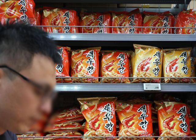 农心辛拉面及虾条将于下月起降价,图为首尔一家大型超市中出售的农心虾条。【图片提供 韩联社】