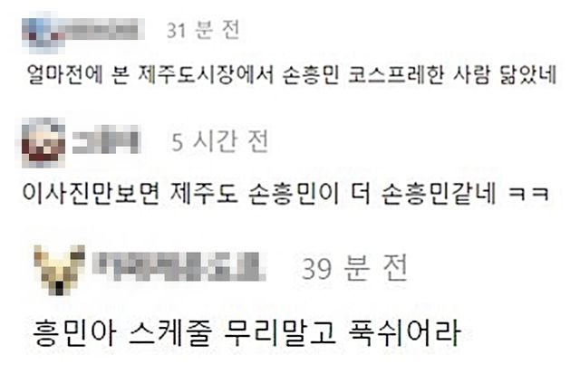 축구 팬들은 "이 사진만 보면 제주도 손흥민이 더 손흥민 같네", "흥민아 스케줄 무리하지 말고 푹 쉬어라" 등의 댓글을 남겼다.