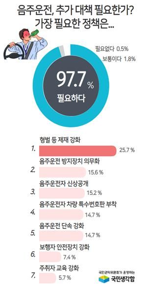 이외에도 추가 의견에서 ‘음주운전 신고포상제 도입’, ‘음주운전자 면허 재취득 신청 제한’ 등 정책 제안도 많았다.