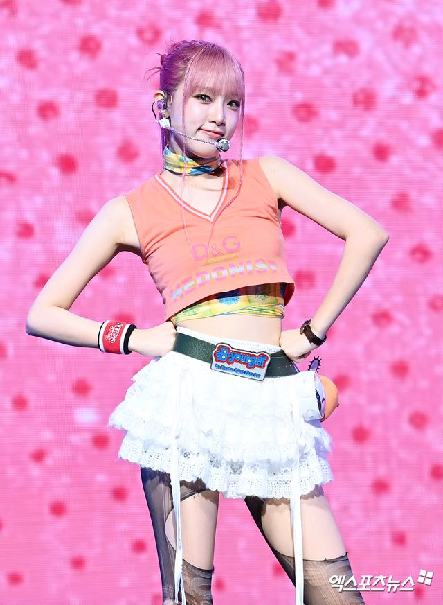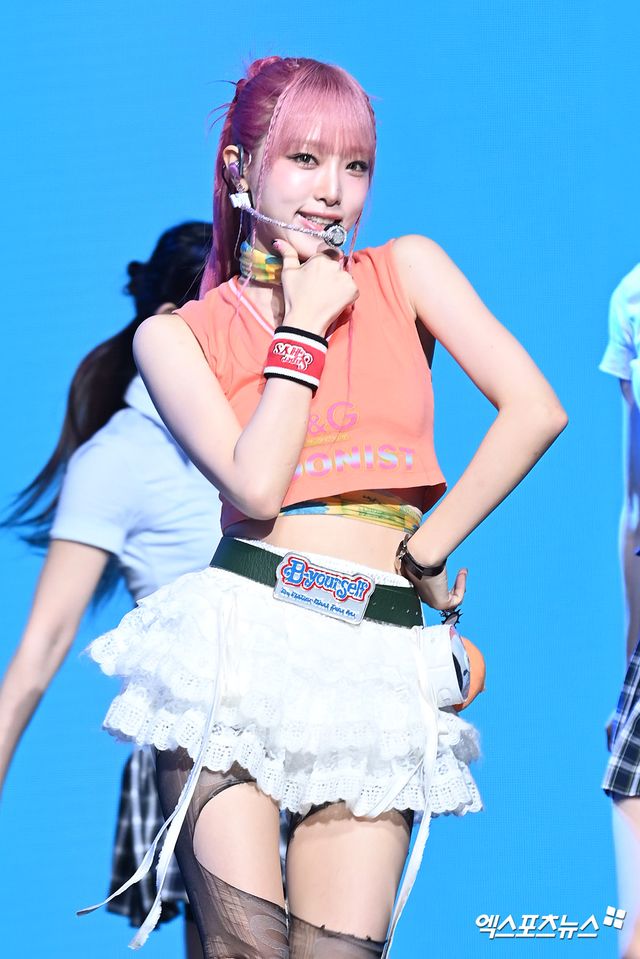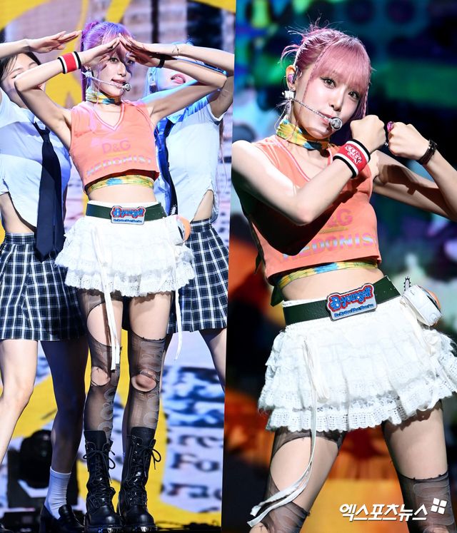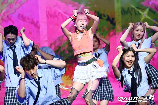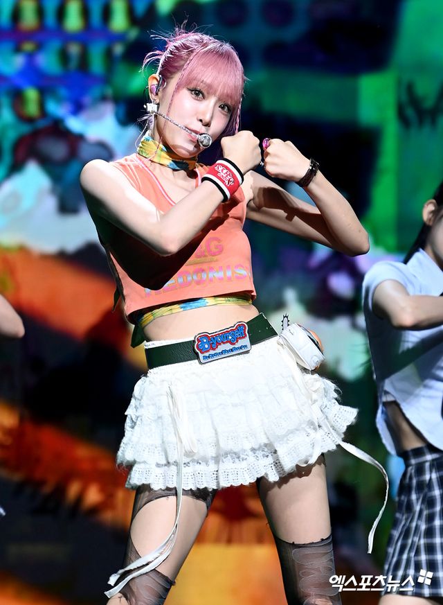 가수 최예나가 타이틀곡 '헤이트 로드리고(Hate Rodrigo)' 무대를 펼치고 있다.