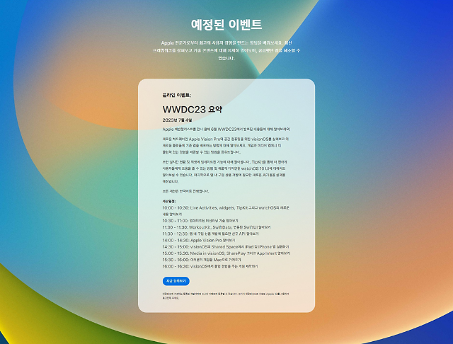 이날 애플은 공식 웹사이트에 ‘WWDC 23 요약’이라고 이름 붙인 행사를 공지하고 “새로운 하드웨어인 비전 프로와 공간 컴퓨팅을 위한 비전OS(visionOS)를 살펴 보고 이 새로운 플랫폼에 기존 앱을 배포하는 방법에 대해 알아보라”면서 “게임과 미디어 앱에서 더 몰입력 있는 경험을 제공할 방법을 공유한다”고 설명했다.