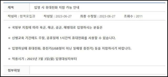 '입영 시 휴대전화 지참 가능 안내' 제목으로 27일 올라온 병무청 공지 / 병무청 공식 홈페이지