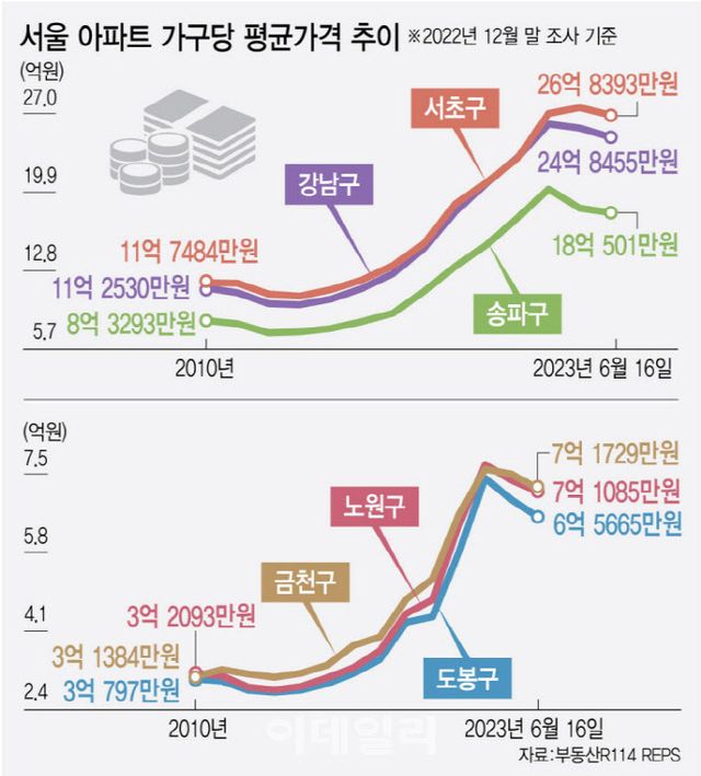 서울 서초구의 가구당 아파트 평균매맷값이 노원구 아파트 평균매맷값의 약 4배에 달하는 것으로 나타났다. 금리 인상 여파로 거래절벽이 이어지면서 집값이 조정받은 가운데 강남권은 이전 가격대를 회복하는 모습이지만 강북권은 가격 반등이 더딘 상황이다. 이처럼 서울 내에서도 양극화가 심화하면서 점차 상급지로의 ‘갈아타기’가 쉽지 않은 모습이다.