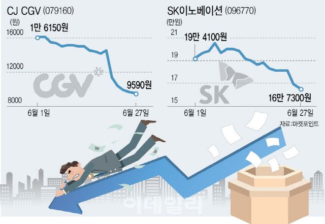 27일 마켓포인트에 따르면 이날 CJ CGV는 9590원으로 거래를 마쳐 전날 대비 2.04% 하락했다. 이달 초 6월1일 종가 1만6150원과 비교하면 40.6% 하락했다. 전날에는 장중 9340원까지 내려가면서 52주 신저가를 경신하기도 했다. SK이노베이션은 16만7300원으로 거래를 마쳐 전날 대비 2.45% 떨어졌다. SK이노베이션 역시 이달 초 19만4100원과 비교하면 13.8% 하락했다.