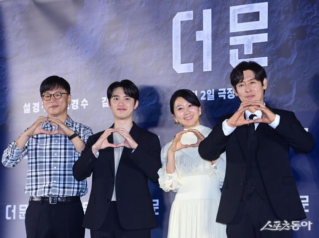 김용화 감독, 배우 도경수, 김희애, 설경구(왼쪽부터)가 27일 서울 용산구 CGV용산아이파크몰점에서 열린 영화 ‘더 문’ 제작보고회 무대에 올라 손으로 하트 모양을 만들고 있다. 주현희 기자 teth1147@donga.com