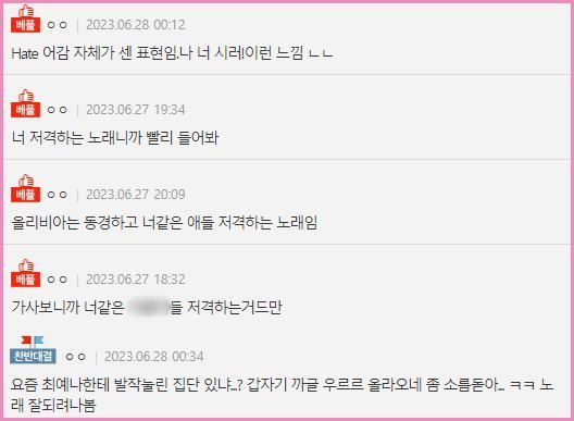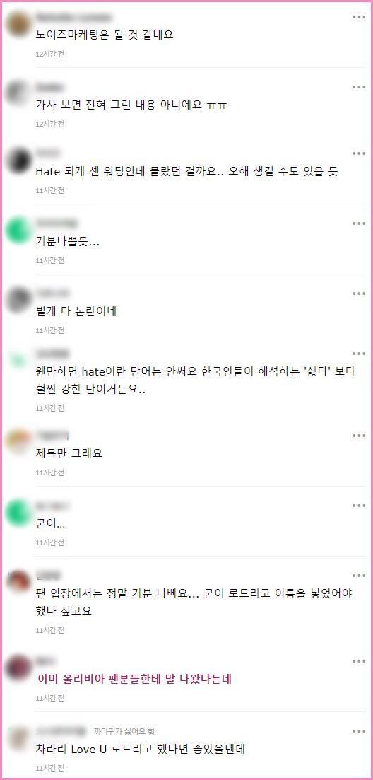 반면 다른 네티즌들은 "그냥 노이즈 마케팅 같다", "올리비아는 동경하고 불편해하는 애들 저격하는 노래다", "대놓고 오마주인데 무슨 소리냐", "이게 왜 불편하냐", "갑자기 이러는 거 좀 소름 돋는다", "가사 보면 전혀 그런 내용 아닌데", "별 게 다 논란이네" 등 논란에 대해 이해할 수 없다는 반응을 보이기도 했다.