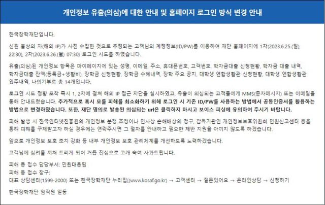 재단은 ▲성명 ▲이메일 주소 ▲휴대전화 번호 ▲고객 번호 ▲학자금대출 신청현황 ▲학자금 대출 내역 ▲학자금대출 잔액(등록금+생활비) ▲장학금 신청현황 ▲장학금 수혜내역 ▲장학 주요 공지 ▲대학생 연합생활관 신청현황 ▲대학생 연합생활관 입주내역 ▲나의 기부 등 총 14가지 항목이 유출된 것으로 의심한다.