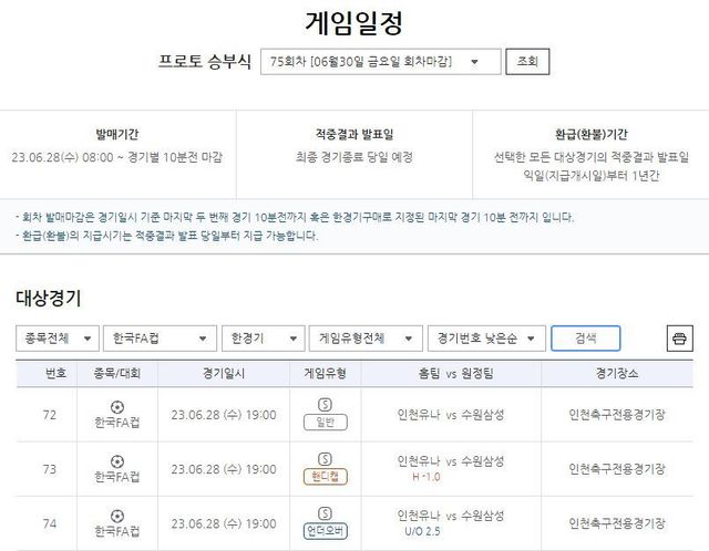 국민체육진흥공단에서 발행하는 체육진흥투표권 스포츠토토의 수탁사업자 스포츠토토코리아가 28일(수) 오후 7시 열리는 ‘2023 하나원큐 FA컵’ 8강 인천 유나이티드(홈)-수원 삼성(원정)전을 대상으로 하는 프로토 승부식 75회차 ‘한경기구매’ 게임이 마감을 앞두고 있다고 밝혔다.