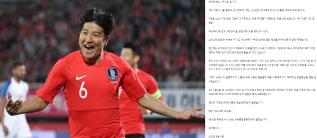 그러면서 "이 글을 쓰는 지금 많은 기분이 교차한다. 처음 축구를 시작했던 일, 처음으로 프로선수·국가대표가 된 일 등"이라며 과거 축구인으로서 쌓아왔던 이력에 대해 언급했습니다.