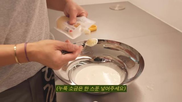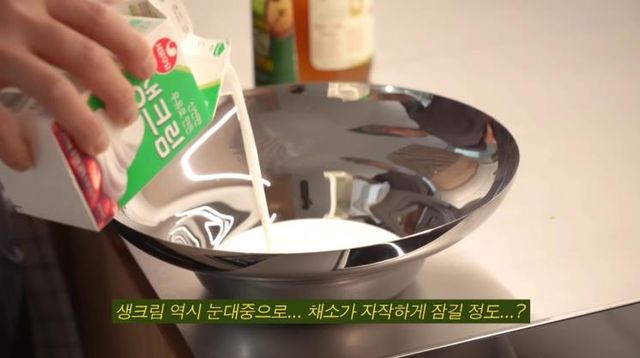 ❹ 준비한 소스 재료(생크림, 다진 마늘, 누룩 소금, 맛소금)로 소스를 만든다.