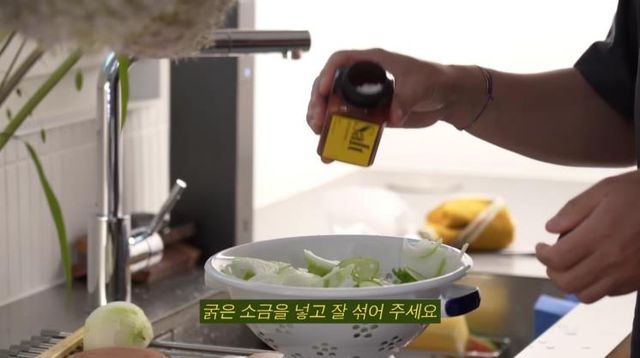 ❸ 채반에 손질한 오이와 양파를 넣고 굵은소금을 뿌려 잘 섞은 뒤 20분 정도 절인다.