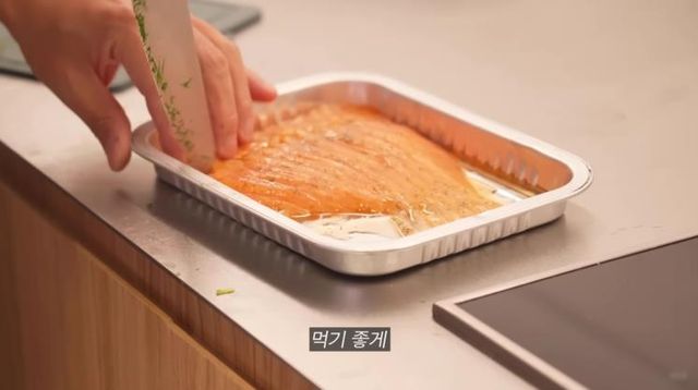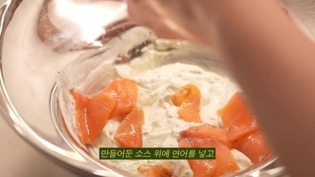 ❼ 훈제 연어를 먹기 좋은 크기로 썬다.