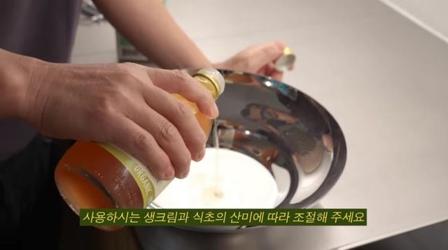 ❻ 소스에 식초와 레몬즙을 넣는다.