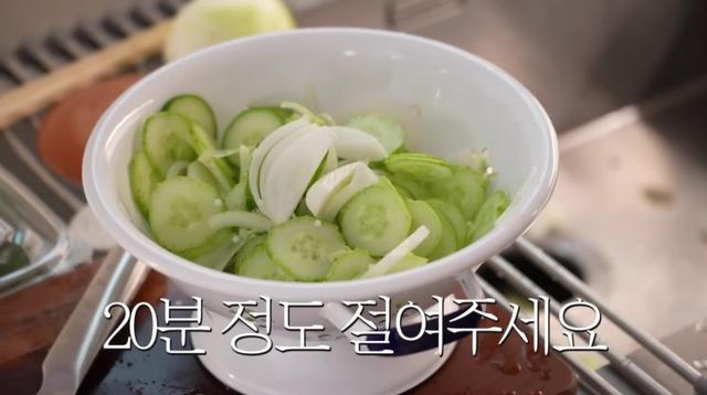 ❸ 채반에 손질한 오이와 양파를 넣고 굵은소금을 뿌려 잘 섞은 뒤 20분간 절인다.