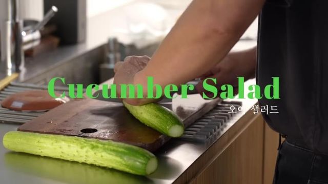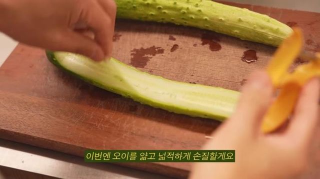 ❶ 오이 필러를 활용해 오이를 얇고 넓적하게 손질한다.