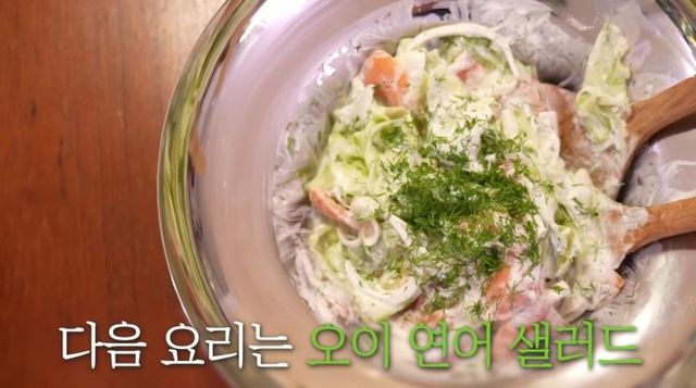 오이 2개, 양파 1/2개, 굵은소금 약간, 생크림 200ml, 다진 마늘 1/2스푼, 누룩 소금 1스푼, 맛소금 약간, 딜, 식초 3스푼, 레몬즙, 훈제 연어 180g, 후추 약간