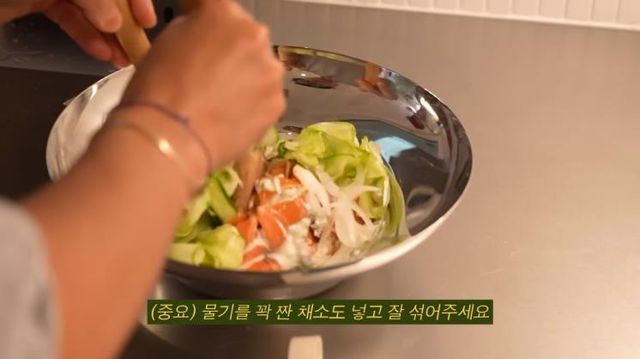 ❻ 절인 오이와 양파의 물기를 키친타월로 눌러서 완전히 제거한다. (중요!)