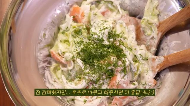 ❼ 커다란 볼에 물기를 뺀 채소와 소스, 딜을 넣고 섞는다.