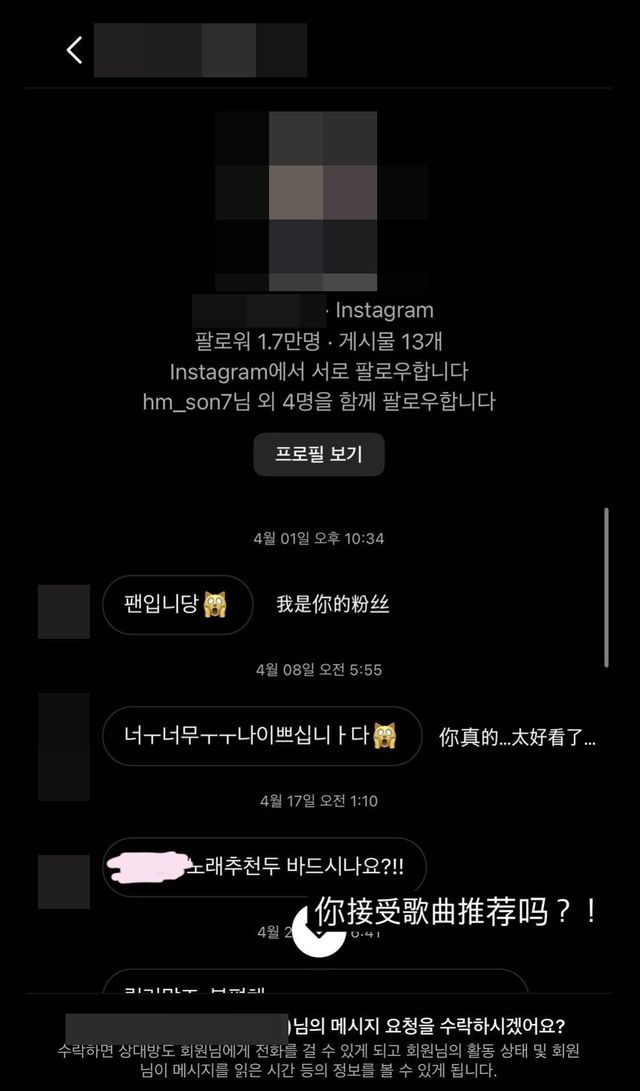 이와 함께 첫 번째 여성이 공개한 사진에는 A씨로부터 "팬이다", "너무너무 예쁘다", "노래 추천도 받냐", "애니메이션 이름이 뭐냐", "바다 짱 예쁘다", "생일 축하드린다" 등 일방적인 메시지를 받은 내용이 담겨 있어 눈길을 끌었다.