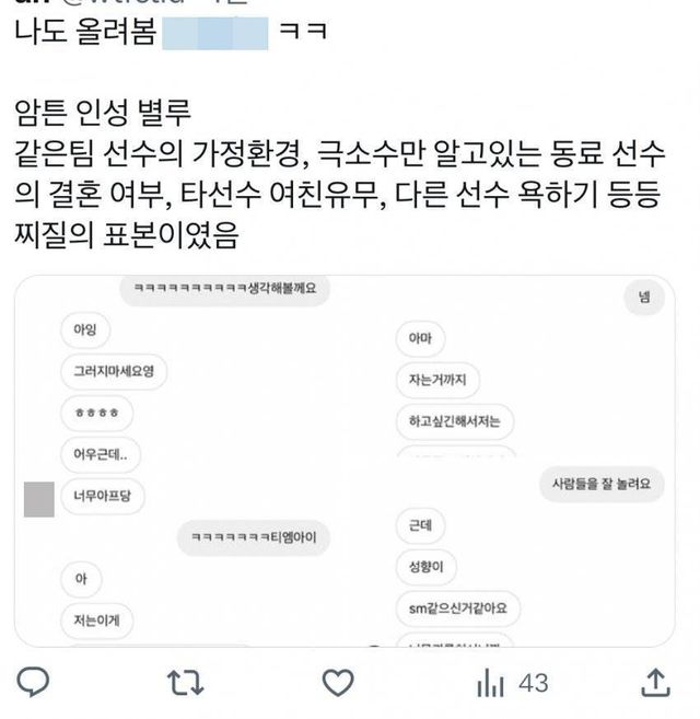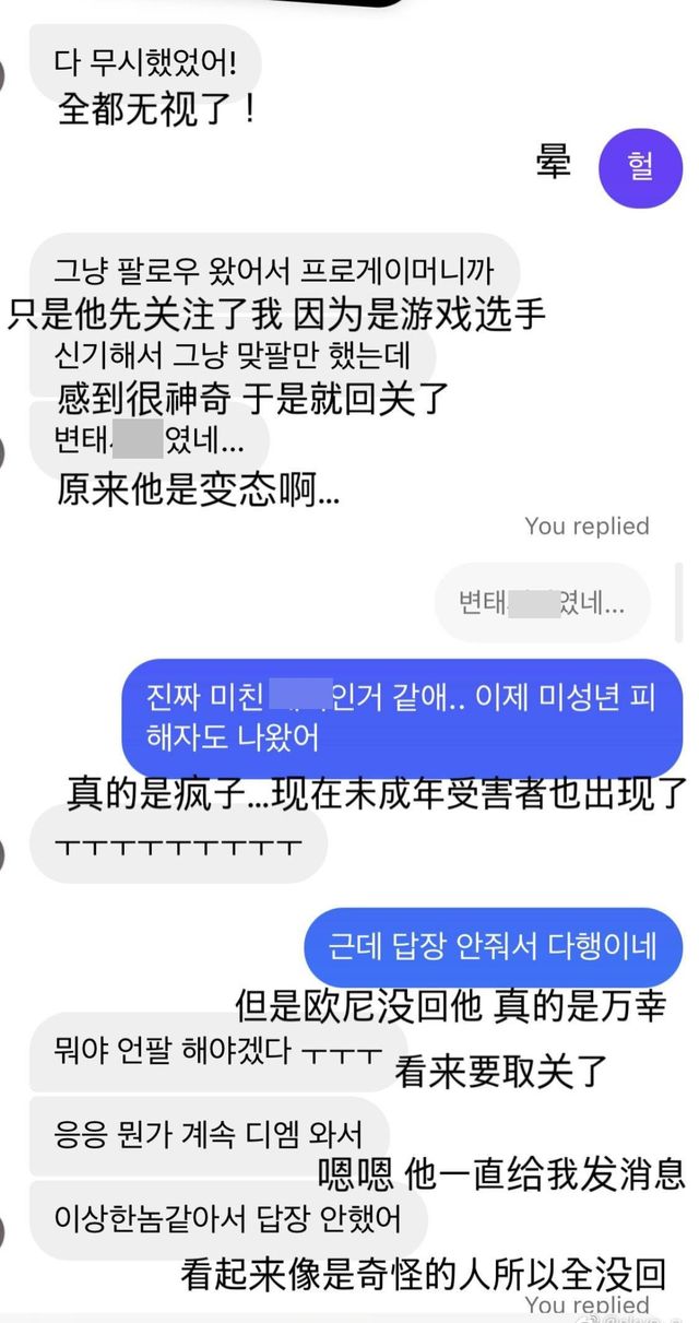 이어 두 번째 여성이 다른 여성과 나눈 대화 내용에는 "(이상한 메시지 받고) 다 무시했었다"며 "그냥 팔로우 요청이 왔는데 프로게이머니까 신기해서 맞팔만 했다"며 "언팔 해야겠다. 뭔가 계속 디엠(DM, 다이렉트 메시지)이 와서 이상한 X 같아서 답장 안 했다"고 설명했다.