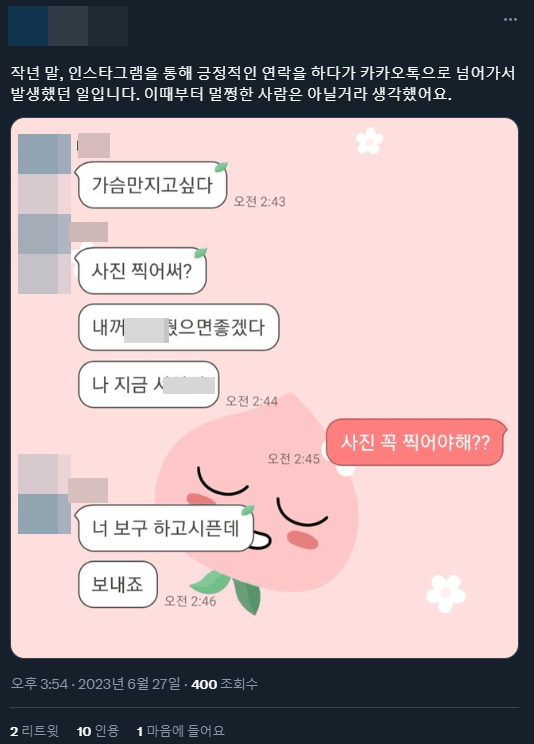 네 번째 여성은 자신의 트위터를 통해 "작년 말, 인스타그램을 통해 긍정적인 연락을 하다가 카카오톡으로 넘어가서 발생했던 일"이라며 "이때부터 멀쩡한 사람은 아닐 거라 생각했다"고 A씨와 나눈 메시지를 공개했다.