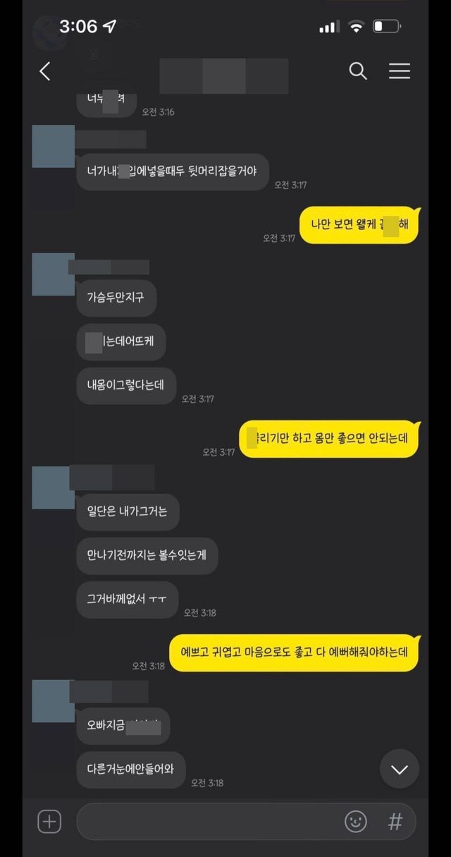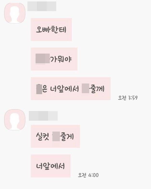 A씨는 여섯 번째 여성에게 "너무 X려", "너가 내 XX 입에 넣을 때도 뒷머리 잡을 거야", "가슴도 만지고", "X리는데 어떡해", "내 몸이 그렇다는데", "오빠 지금 X있다", "다른 거 눈에 안 들어온다" 등의 메시지를 보냈다.
