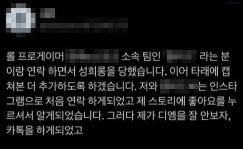 당시 피해 여성은 해당 폭로 글에서 "프로게이머 A씨와 연락을 주고받으며 성희롱을 당했다. 처음엔 인스타그램을 통해 연락하게 됐고 나중에는 카톡으로 옮겨갔다"며 "A가 전화번호도 줬다. 내가 카톡을 읽지 않자 '젖소'라고 칭하며 꾸준히 연락했다"고 주장했다.