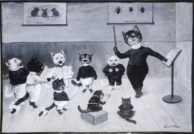 루이스 웨인 (Louis Wain)의 삽화에는 사람처럼 행동하거나 정장을 차려입는 등 의인화된 고양이의 모습이 대거 출현한다. 그는 유방암으로 투병 중인 아내를 위해 제작한 입양묘 피터 일러스트레이션을 계기로 본격적으로 고양이를 화폭에 담기 시작했다. 점잖은 척 품위를 지켜야 했던 당시 런던 귀족들은 표정과 행동을 여과 없이 드러내는 고양이들의 모습에 열광했다. “피터는 이 나라의 고양이에 대한 경멸을 완전히 없애고, 노처녀들이나 관심을 가지고 키운다는 편견을 가정 내 반려동물로 영원히 바뀔 수 있도록 도움을 주었습니다.” 웨인의 고양이는 인쇄물, 책, 잡지, 엽서 및 연감에 실리며 1880년대 당시 영국인들의 고양이에 대한 부정적 인식을 깨부수는 중추적인 역할을 했다.
