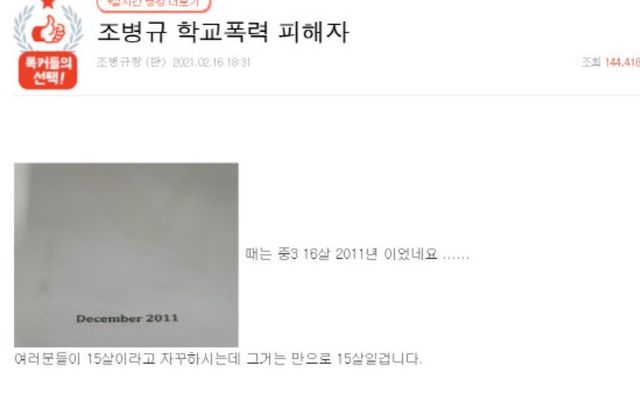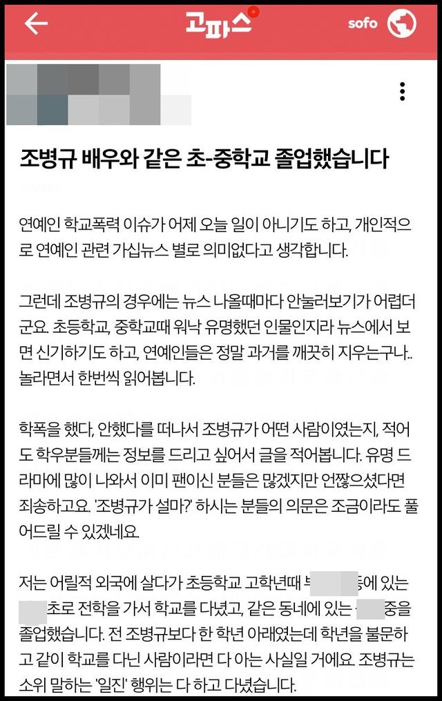 조병규에게 학교 폭력을 당했다고 주장한 세 번째 폭로자 / 고파스