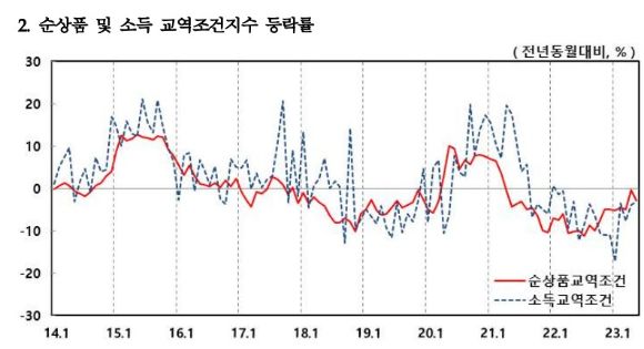 순상품교역조건지수는 한 단위 수출대금으로 수입할 수 있는 상품의 양을 지수로 나타낸 것이다. 수치가 100에 못 미치면 수입품에 비해 수출품이 상대적으로 제 가격을 받지 못하고 있다는 뜻이다. 전달 83.94로 3월 대비 소폭 상승하며 개선 흐름을 보이는 듯했으나 한 달 만에 내림세로 돌아섰다.