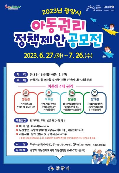 [파이낸셜경제=김영란 기자] 광양시는 아동의 권리가 존중되는 아동친화도시 조성을 위해 ‘2023년 광양시 아동권리 정책제안 공모전’을 6월 27일부터 7월 26일까지 진행한다고 밝혔다.