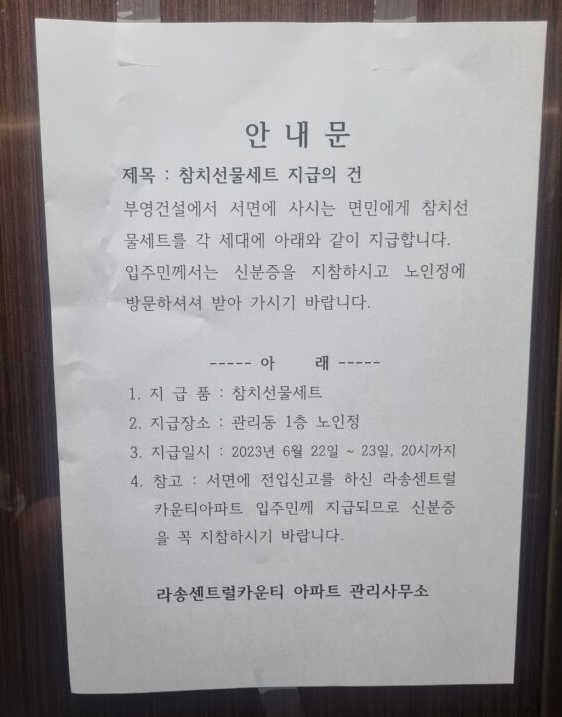 부영건설이 순천시 서면 강천길에 있는 라송센트럴카운티 아파트 입주민들에게 참치세트를 전달하는 안내문이 엘리베이터에 부착돼 있다./독자 제공