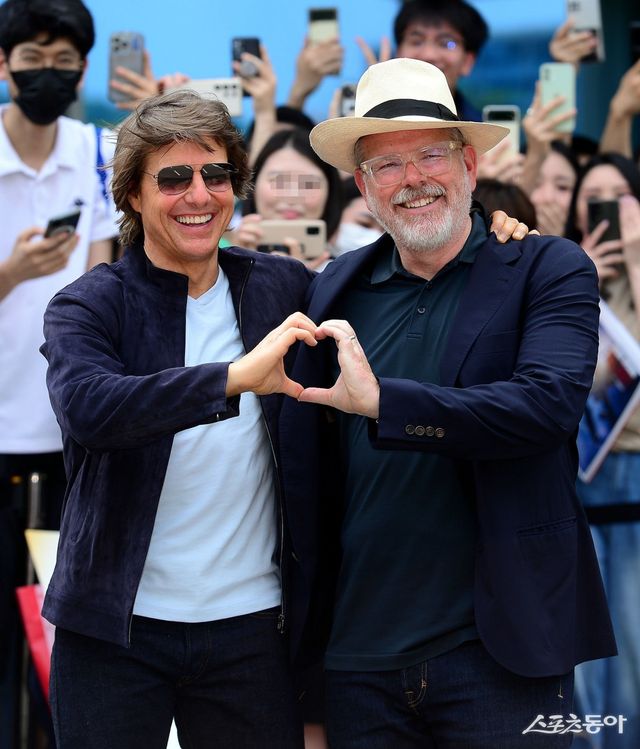 영화 ‘미션임파서블: 데드 레코닝 파트1’의 주역인 톰 크루즈와 크리스토퍼 맥쿼리 감독(왼쪽부터)이 28일 서울 강서구 김포국제공항을 통해 입국한 후 팬들을 향해 손하트를 그리고 있다. 김민성 기자 marineboy@donga.com