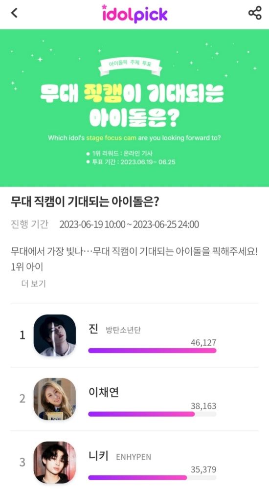 뒤를 이어 이채연이 38,163픽을 받아 2위, 엔하이픈 니키가 35,379픽을 받아 3위를 차지했다.