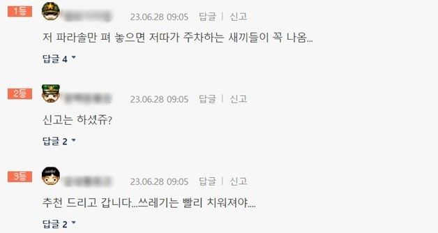 해당 게시물을 접한 누리꾼들은 "저 파라솔만 펴 놓으면 저 장소에 주차하는 사람들이 꼭 나온다", "신고는 하셨죠?", "단단히 미쳤다! 차주 행동이 진심 놀랍다", "이거 진심 너무한다!", "폐차가 답이다", "여러 명이 신고했으면 좋겠다", "사람이 아닌 자동차가 그늘이라니 정말 너무하다", "요즘 보면 세상이 미친 것 같다", "인도 주차도 신문고 가능하다", "개념 탑재가 안 된 인간인 듯", "와 합성인줄..." 등 다양한 반응을 보였다.