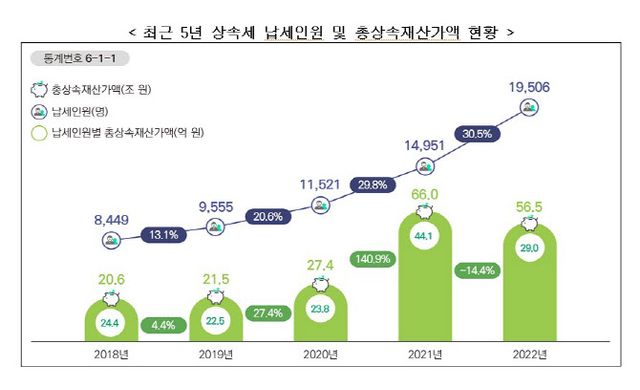 상속세 납세인원 및 재산가액은 부동산 가격상승의 영향으로 크게 증가했다. 작년 상속세 납세인원은 1만9506명, 총상속재산가액은 56조5000억원으로 5년 전 대비 각각 130.9%, 174.3% 증가했다.